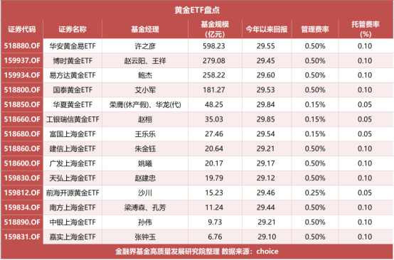 基金规模方面,华安黄金易ETF以598.23亿元的规模占据榜首,博时黄金ETF、易方达黄金ETF规模均突破200亿元;国泰黄金ETF规模为181.27亿元。