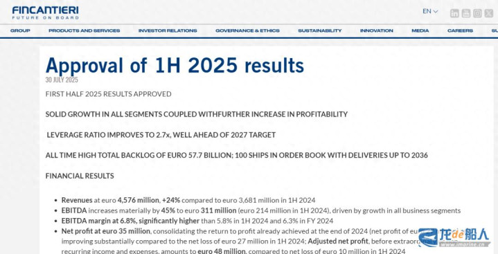 7月30日,Fincantieri在官网披露《2025年上半年业绩核准》。报告期内,Fincantieri订单量创历史新高,在手项目订单总额高达577亿欧元(约合人民币4743.6亿元),新船订单量达100艘,交船期排至2036年。